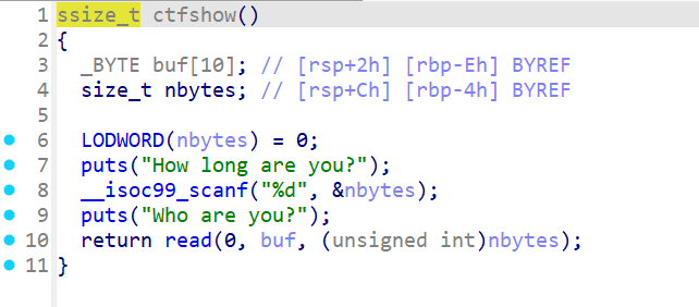 存在整数安全,因为执行read函数时,nbytes为unsigned int类型,而输入时为int类型,因此可以输入-1使nbytes的值变为非常大的正数,造成栈溢出,存在后门函数。