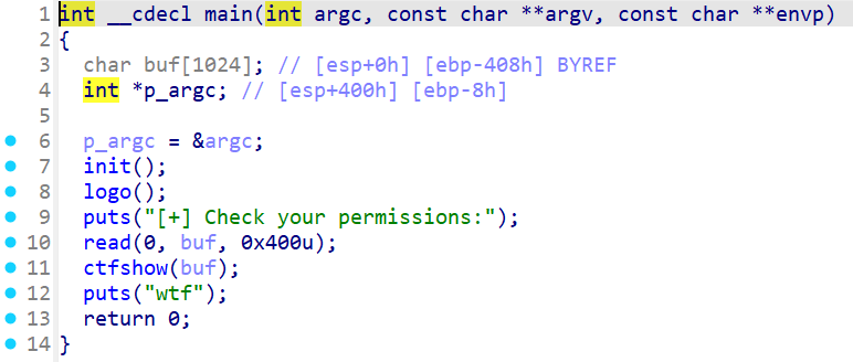 该题主要研究ctfshow函数,由于该函数无法跟进,就只能看汇编。首先调用__x86_get_pc_thunk_bx函数,将当前指令指针的值保存到ebx中,接着调用read函数,将输入的东西保存到缓冲区,然后再打印出来,最后执行缓冲区中存储的代码。