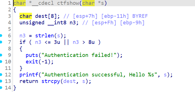 该题的程序流程比较简单,先输入一串字符串,若该字符串的长度满足if语句,则退出程序,这里因为接收字符串长度的变量n3是一个无符号八位的整型,范围0~255,因此可以输入一串较长的字符串,使得n3的值在范围之间即可。