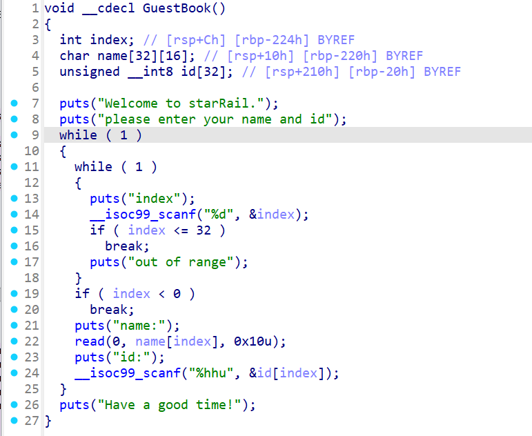可以看出最后id可以修改rbp的一个字节,因为存在GuestBook函数的leave_ret和main函数的leave_ret,又只能改rbp,因此实现了栈迁移,那么修改的rbp的一个字节只需要在输入后门函数的地址之前即可。