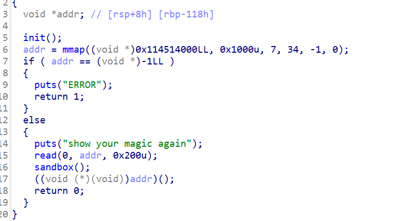 很明显打shellcode,但是开启了沙盒保护,还把orw也禁止了,可以使用openat+sendfile打。
