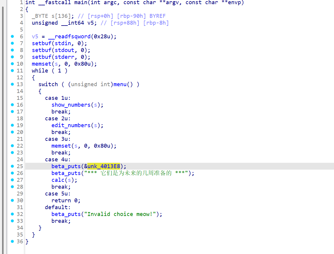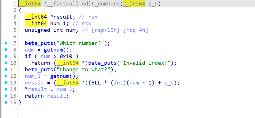 从ida中可以看出,通过选择不同的函数执行不同的指令,根据提示可以知道,本次题目的漏洞应该就在前三个函数中。分别进入三个函数里面看,发现只有edit_numbers函数是我们可以进行输入操作的,因此猜测这里存在漏洞。