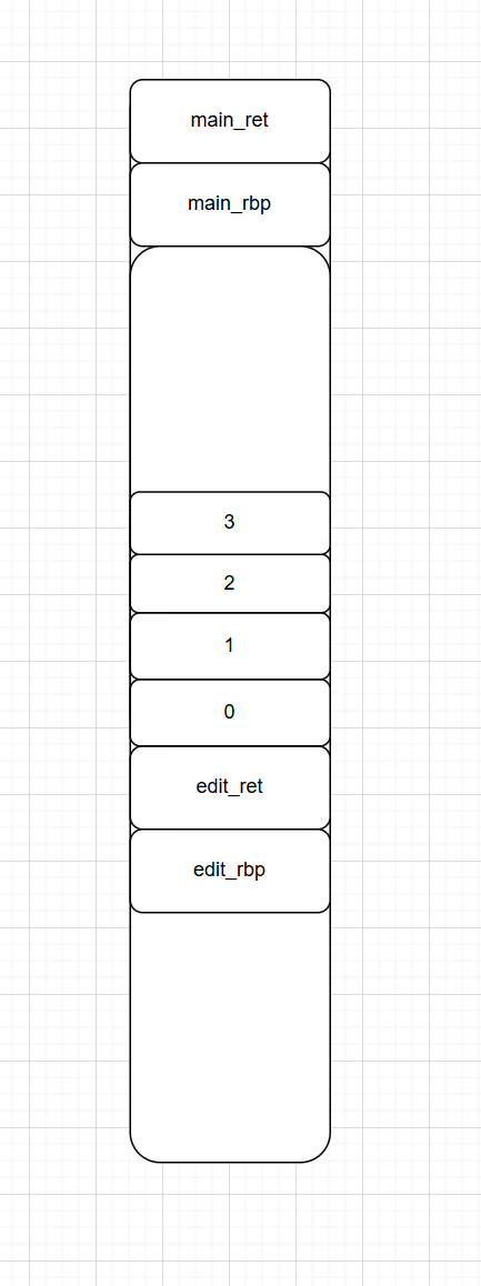 edit_numbers这个函数主要执行修改操作,先选择一块大小为8的区域,再输入数据,大致结构应该是这样(由于本题的漏洞利用没涉及到canary,就没在图中表示出来)
