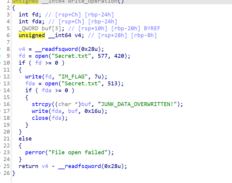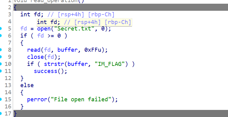 这题想要获取shell,得让buffer的值为IM_FLAG,buffer的值是从Secret.txt文件中读取的,但是从write_operation函数中可以看出似乎是不太可能的,如果按照顺序执行write函数与read函数的话,不能达到相应的目的,这时就得考虑一下连接两个进程同时执行两个函数,造成竞争。