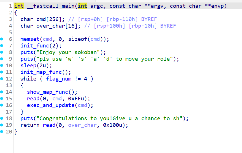 是一个推箱子的游戏,需要将箱子推到指定位置使得flag_num的值为4,然后就能栈溢出。但是经过几次发现好像只能将三个箱子推到指定位置,于是卡了一会儿