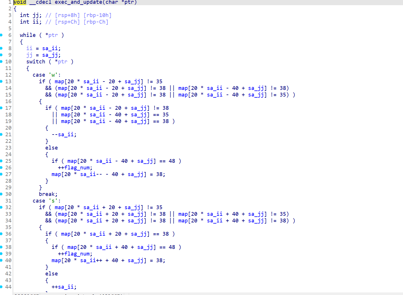 再看一下exec_and_update函数,发现了一个bug,就是只要将箱子推入指定位置就算一次,就算将该箱子再推出指定位置,flag_num的值也不会减少,因此该题就简单了。